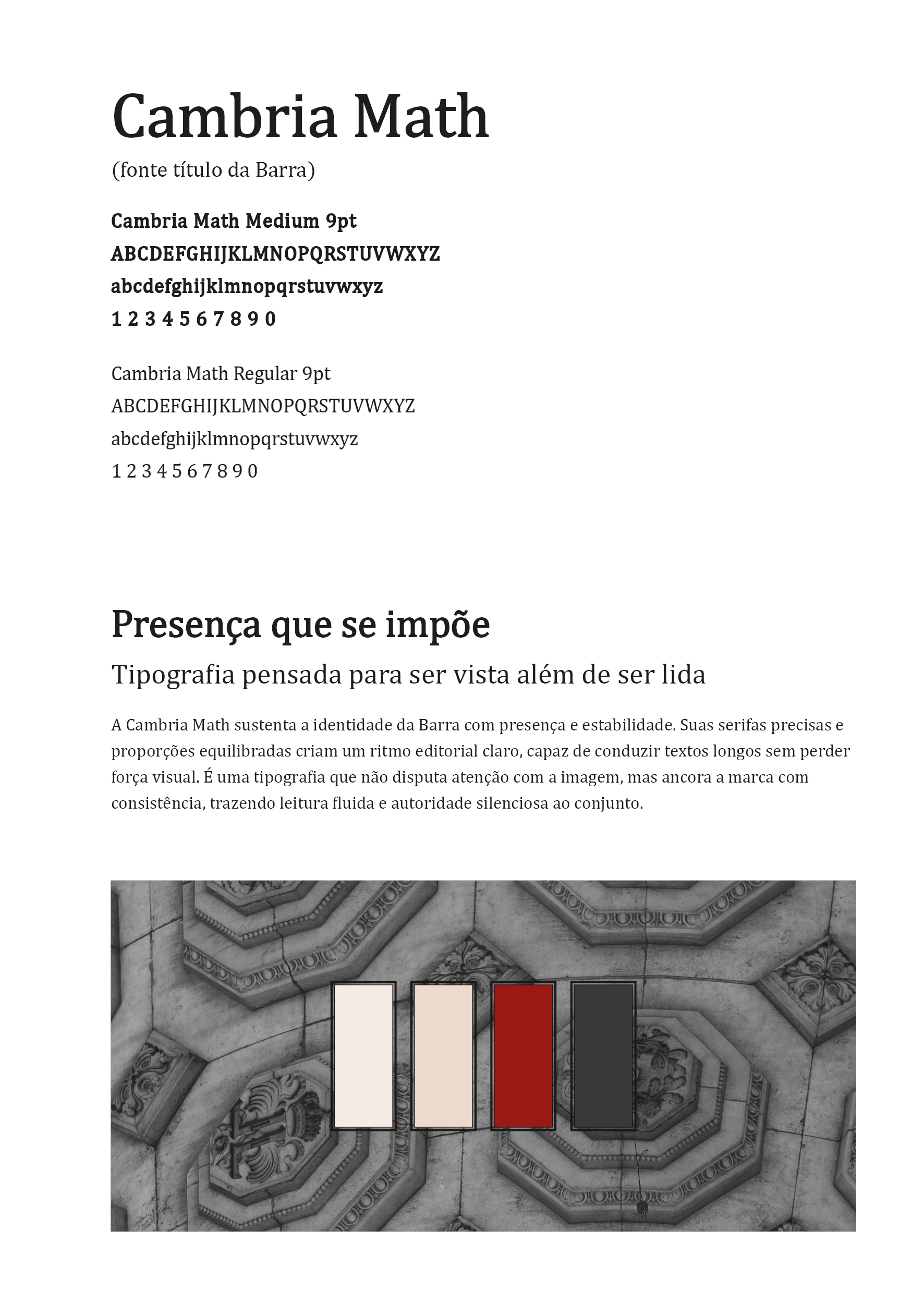 A identidade tipográfica da Barra Editorial é construída a partir da Cambria Math Regular, uma fonte serifada de aparência sólida e clássica. Sua estrutura transmite maturidade e credibilidade, reforçando o caráter editorial da marca e sua conexão com o universo da moda impressa. O uso da serifa sustenta uma leitura elegante, sem excessos, funcionando bem tanto em títulos quanto em aplicações institucionais.